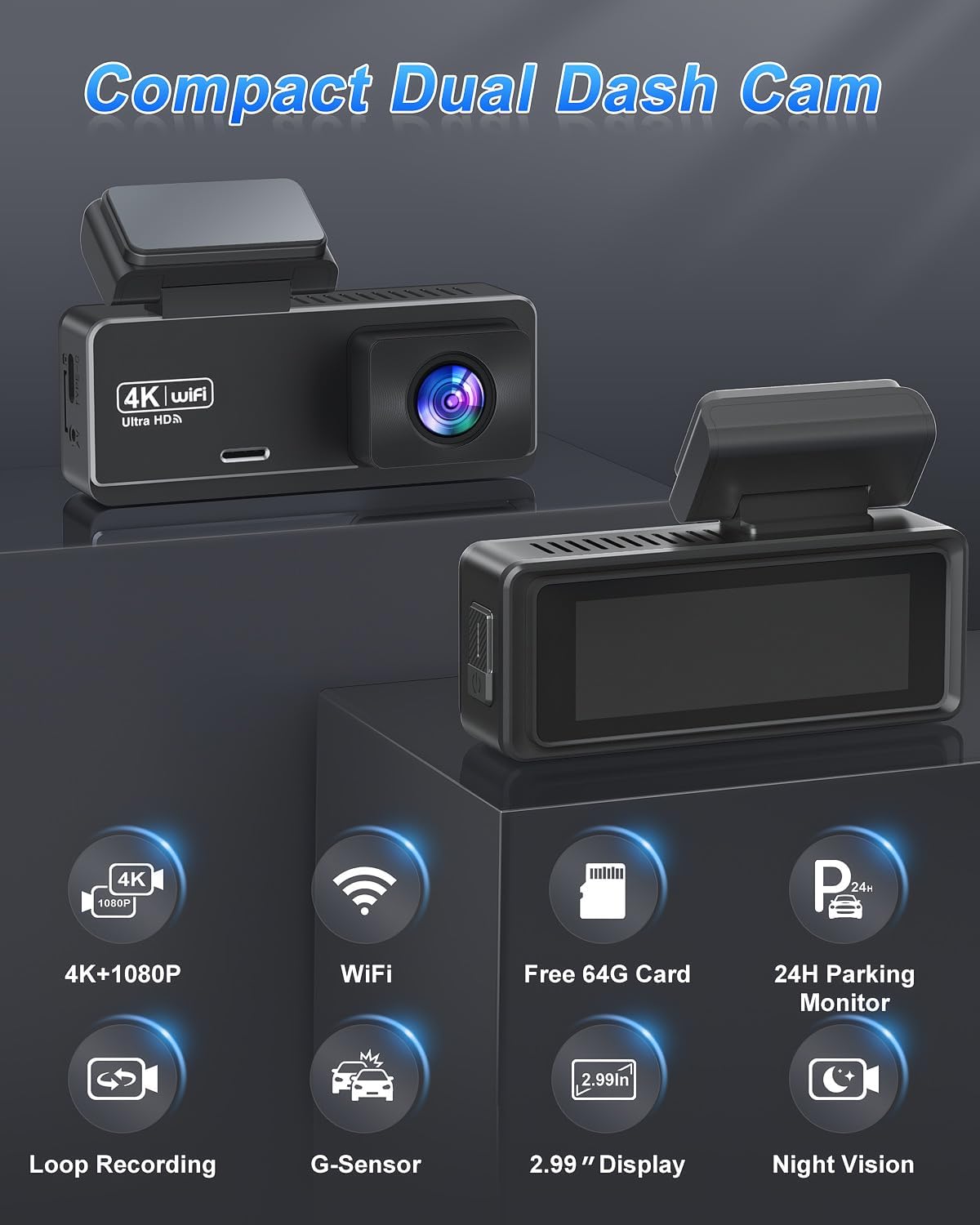 4K Front and Rear Dash Cam with WiFi & 64GB Card, 4K+1080P Car Camera, App-Controlled DashCam with 2.99" Screen, 24-Hour Parking Monitor & G-Sensor