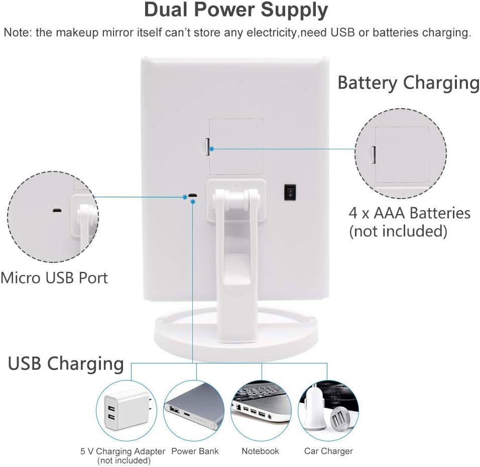 Dual Power Supply Options: Operate the LED mirror using 4 AAA batteries (not included) or the included USB cable. Note: The mirror itself does not store power.