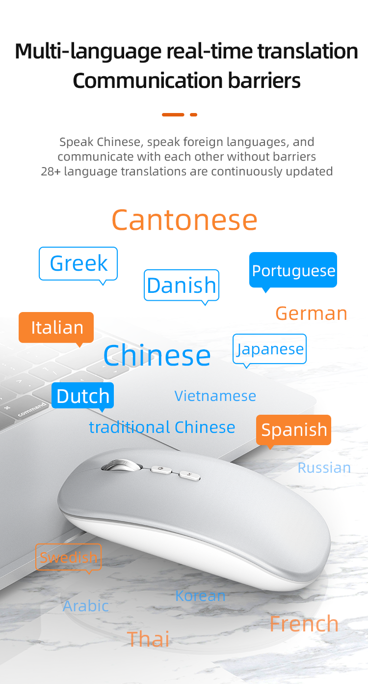 Introducing our AI mouse, your ultimate language and productivity companion. With voice typing, translation, and search functions across 110+ countries, it seamlessly switches between 28 languages. Enjoy precise paragraph translation, silent design, adjustable DPI settings, and ergonomic comfort. Elevate your workspace effortlessly.