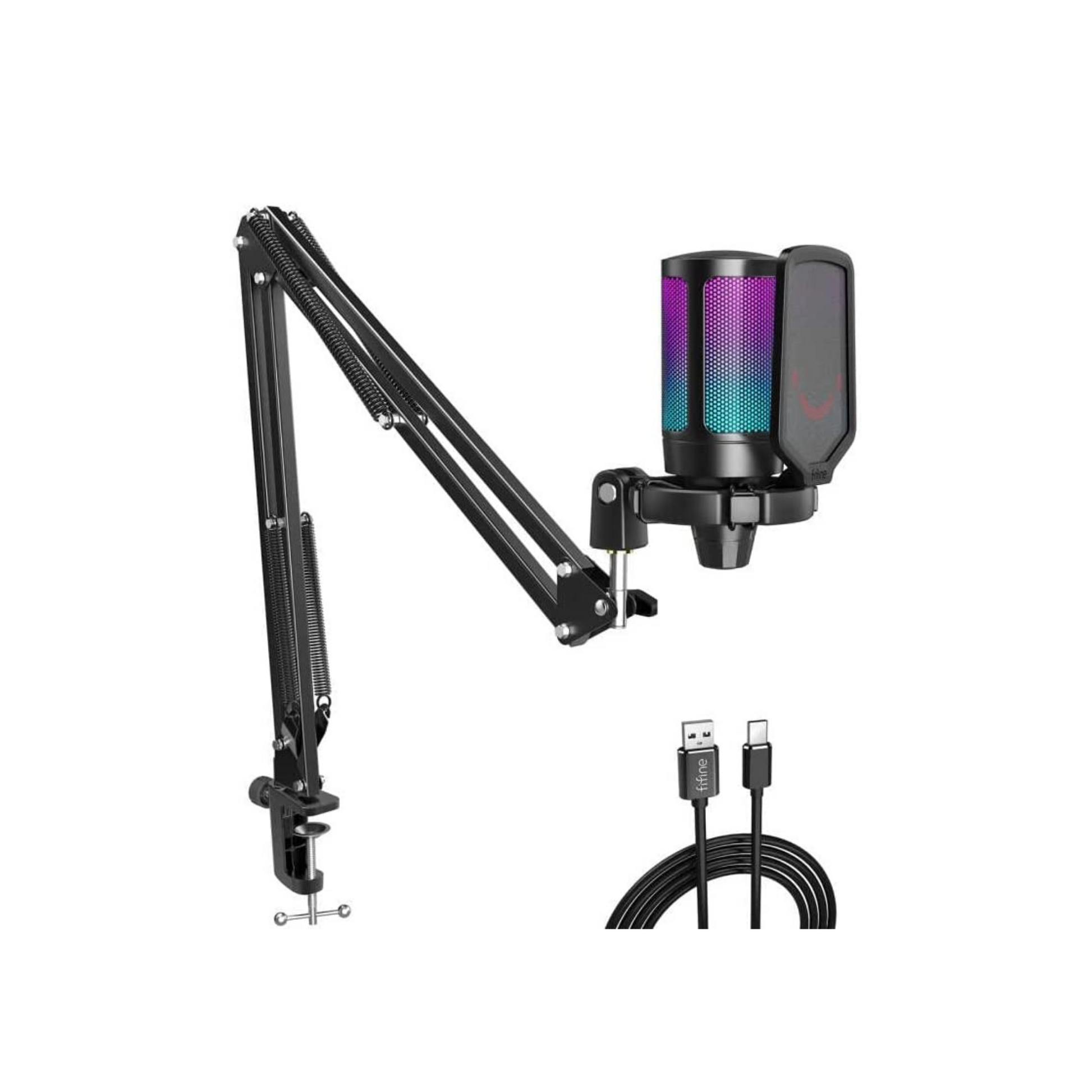 Fifine Gaming Microphone - USB Condenser Mic Kit with RGB, Mute Button, Gain Knob, Boom Arm Stand, Pop Filter for PC Recording