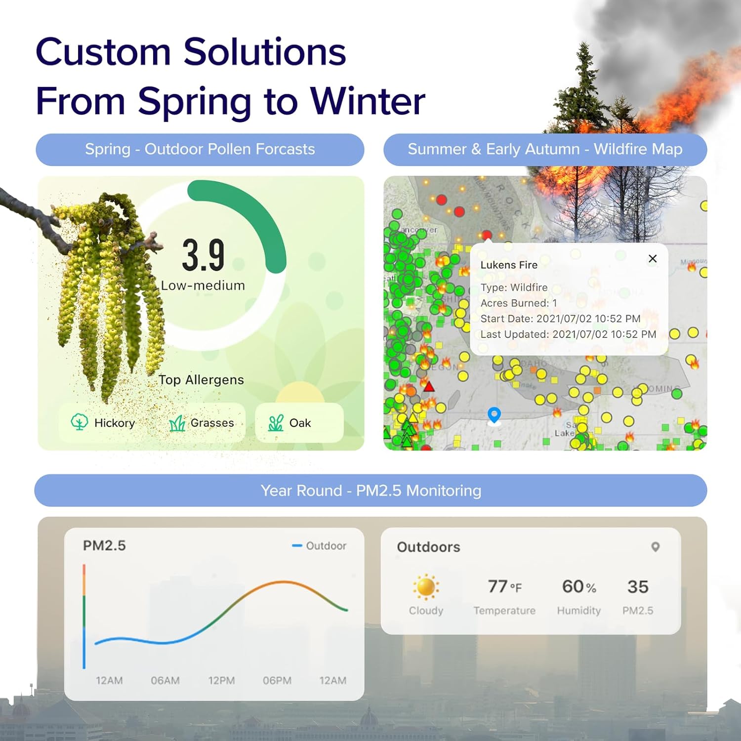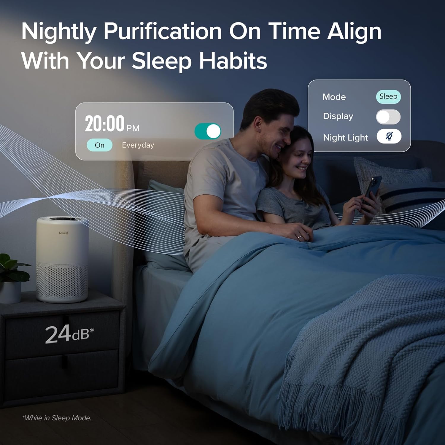 Connect to the free VeSync app to adjust settings, create schedules, set timers, track filter health, and monitor real-time outdoor conditions such as pollen levels and wildfire alerts. Voice control fully supported through Amazon Alexa and Google Assistant.