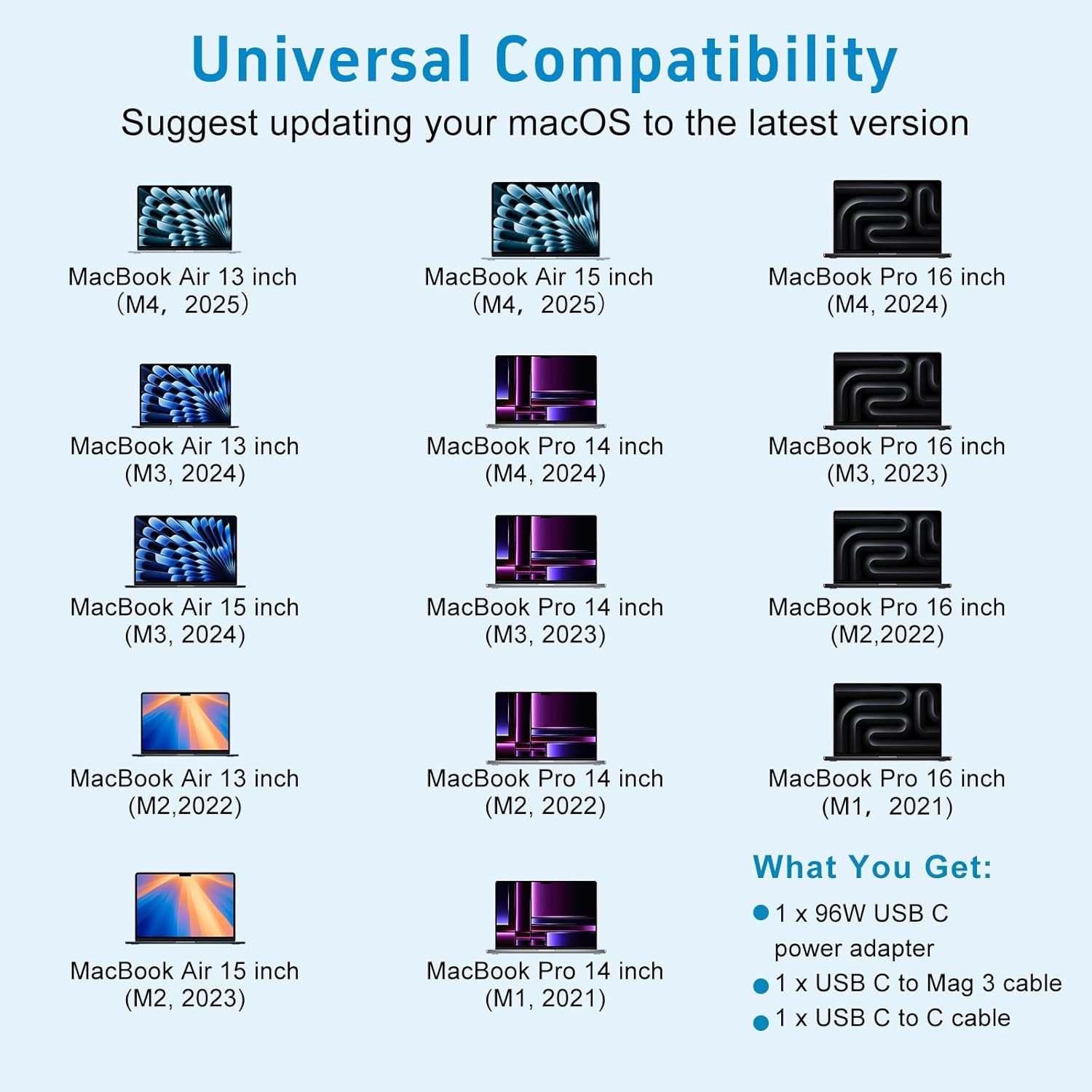 Compatible with MacBook Pro 14/16-inch and MacBook Air 13/15-inch (2021–2025). Works with M1, M2, M3, and M4 series models, plus other USB-C laptops, tablets, and smartphones.