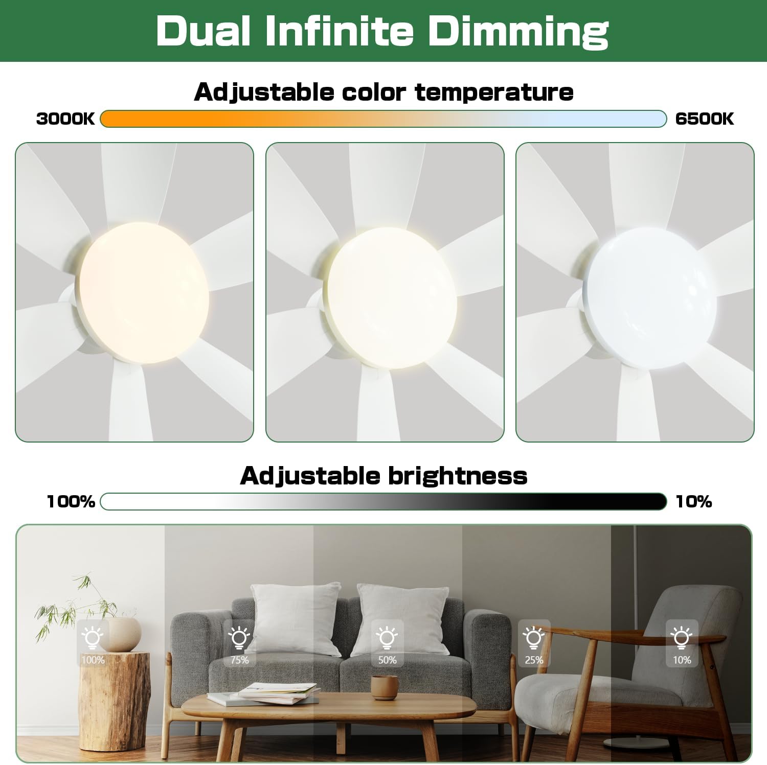 Energy-Efficient LED Light: This fan comes with a built-in LED light source that provides bright, energy-saving illumination. With dual dimming options, you can easily set the color temperature and brightness to suit your mood and create a comfortable lighting environment.