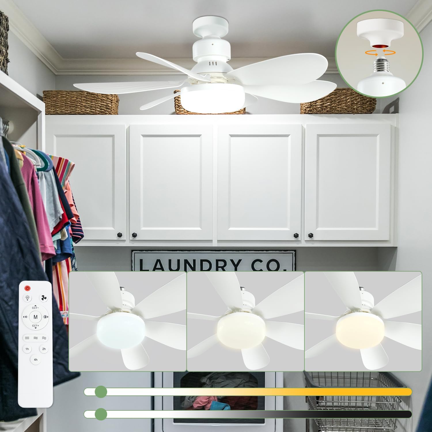 No electrican needed! Screw-in yourself this sleek, space-saving ceiling fan light, perfect for kitchens, bathrooms, closets, and more. Easy to install with an E26 base, this 20.5-inch, 1.22-pound fan features detachable blades. Control fan speed and dimmable LED light with the remote. Customize comfort with three speeds and a built-in timer.