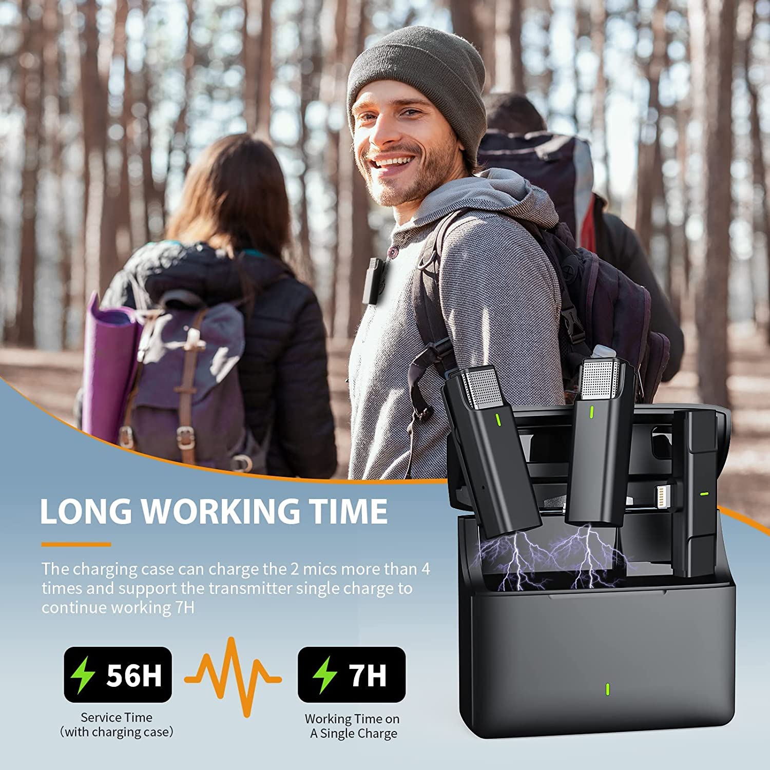 【3 In 1 Portable Smart Charging Case】 The upgraded wireless mic charging case combines storage, pairing and charging in one. It can charge 2 mics for more than 4 times continuously, which is equivalent to the total endurance of mics up to 56hrs. Say goodbye to messy cables, the compact and lightweight design is easy to carry around, and the combination of the two can well meet the needs of multiple people to live streaming at the same time anytime, anywhere