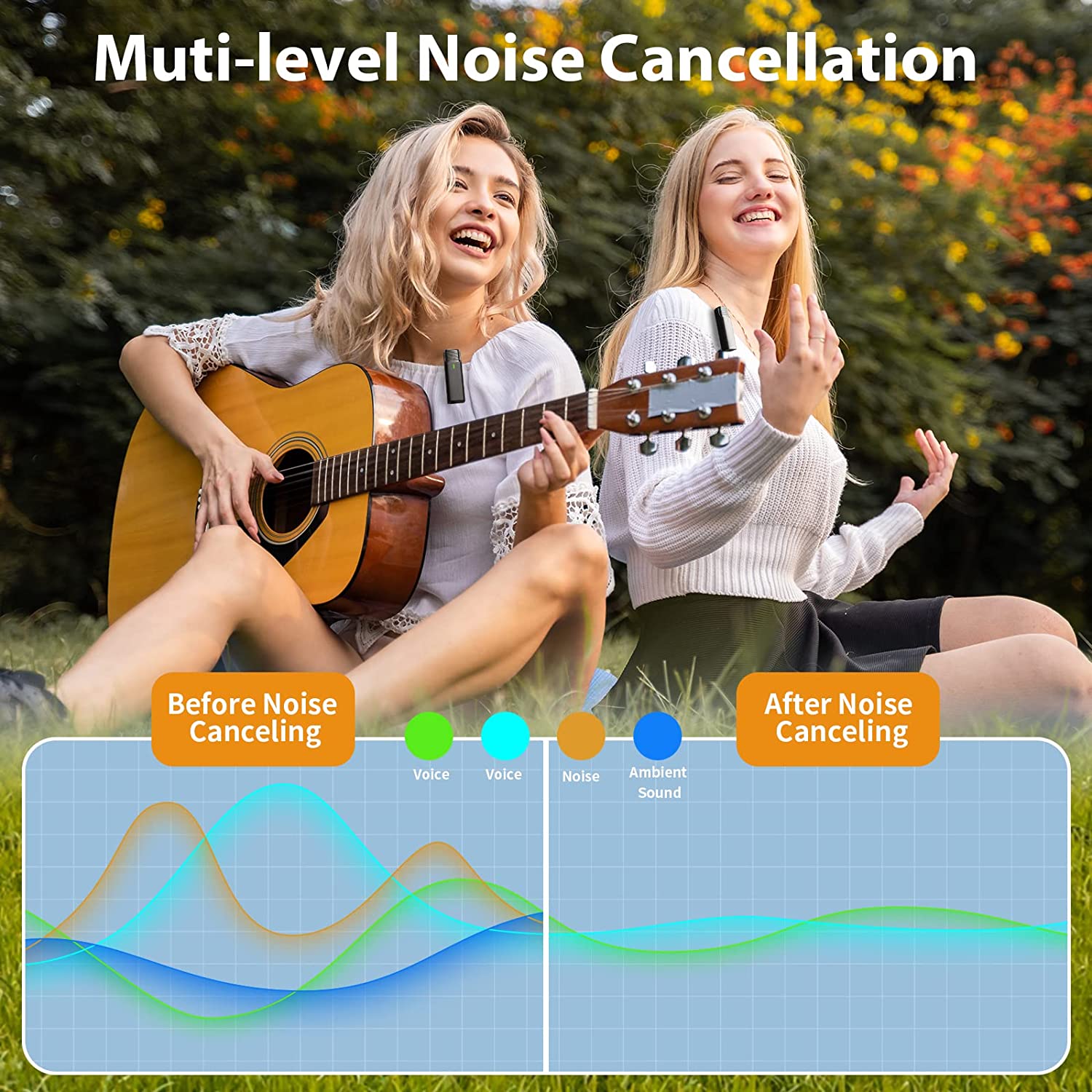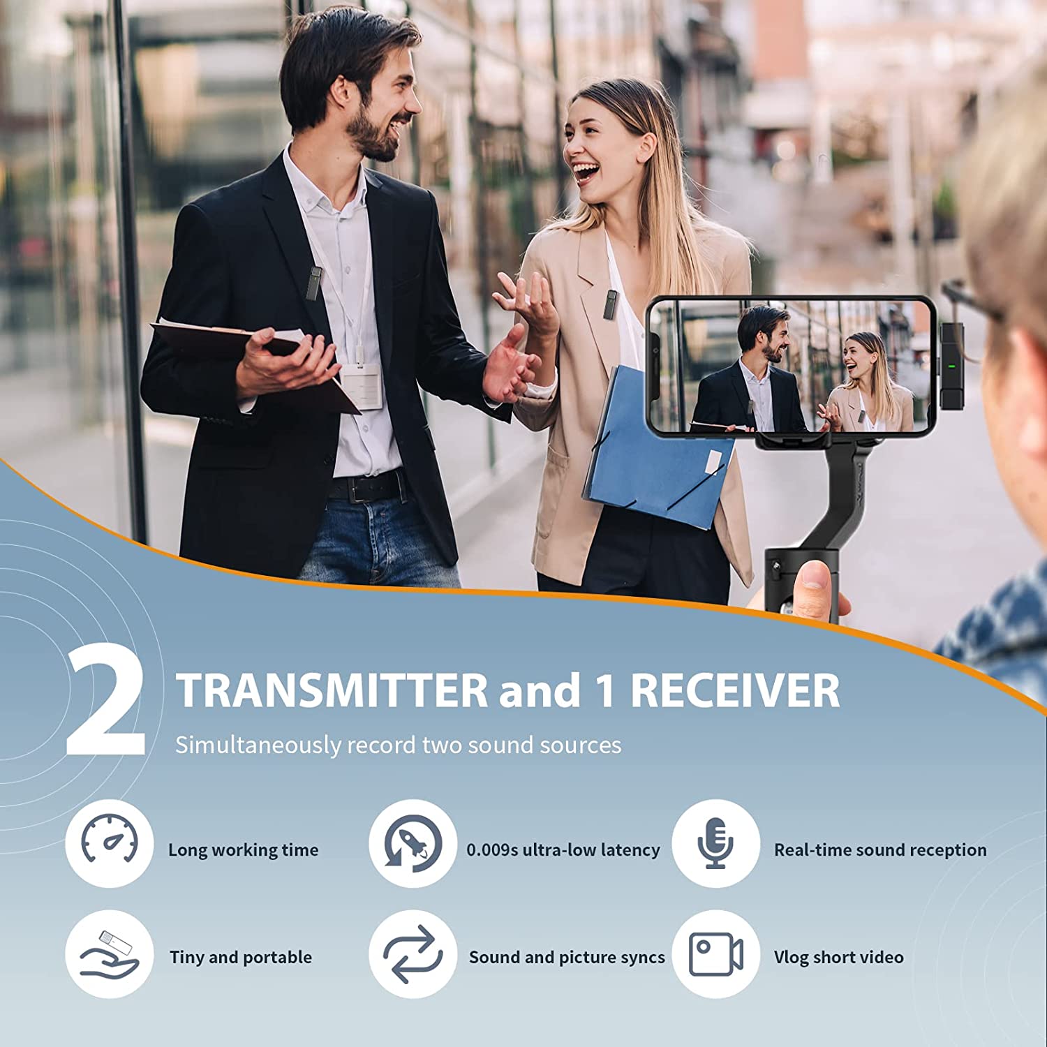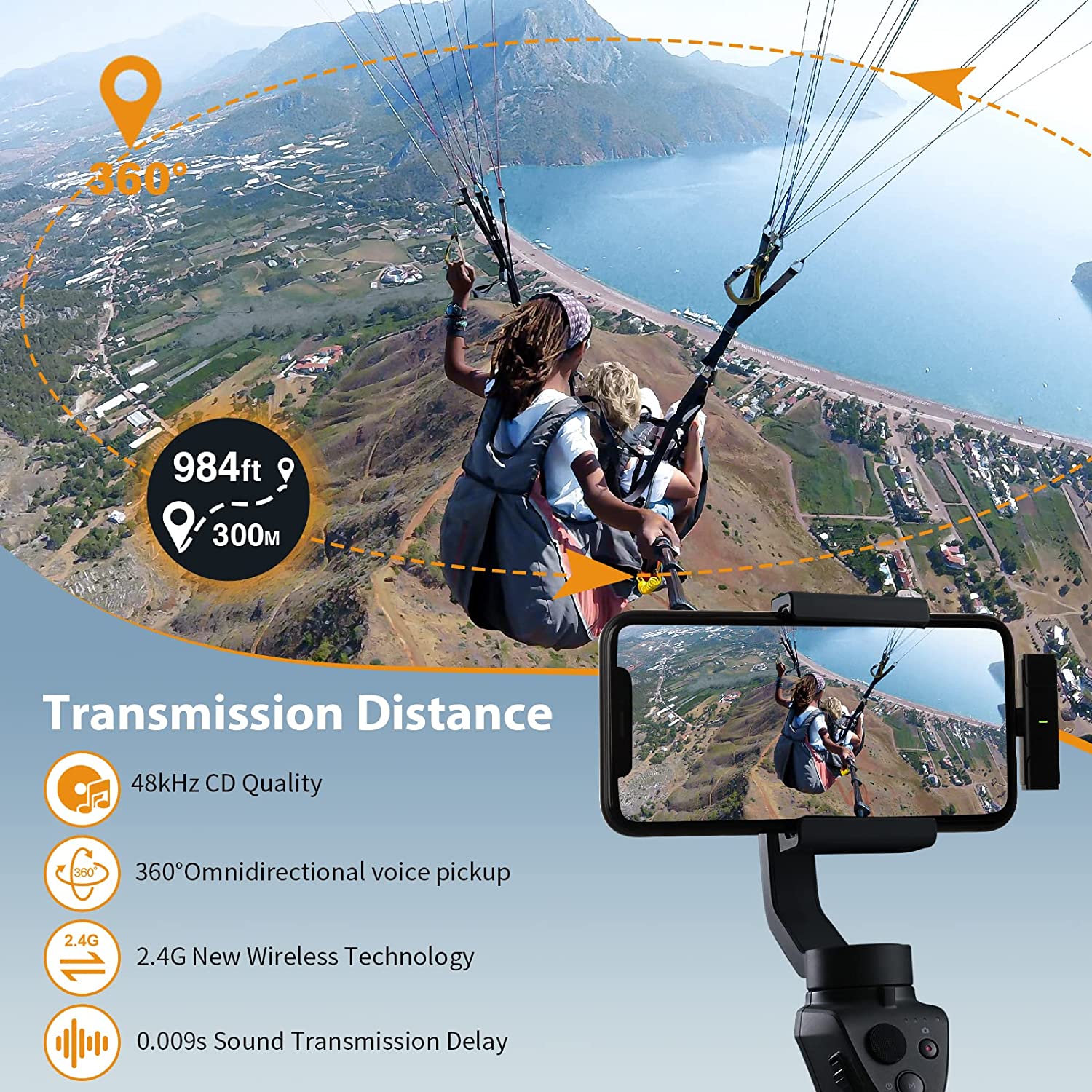 【Intelligent Noise Reduction & Superior Sound Quality】 Using high-sensitivity digital silicon microphone head and DSP intelligent noise reduction chip tech, 360°omnidirectional sound reception and stereo recording up to 48KHz. The wireless mic also has an audio pops preventive design, which can filter noise and retain the original clear sound even in noisy environments! Only 0.009s low latency and real-time synchronization, no need to worry about video post editing