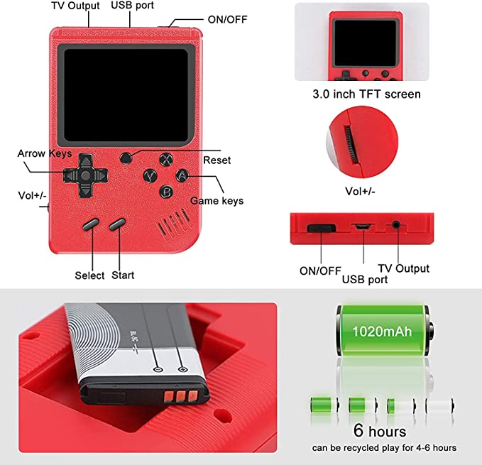 【Rechargeable Battery】 Built-in 1020mAh large capacity lithium battery can be charged. The game can play for up to 5 hours each time it is fully charged. You don't have to worry about running out of power when you are on a business trip, traveling, or camping. (Note: Please fully charge the battery before first use.)