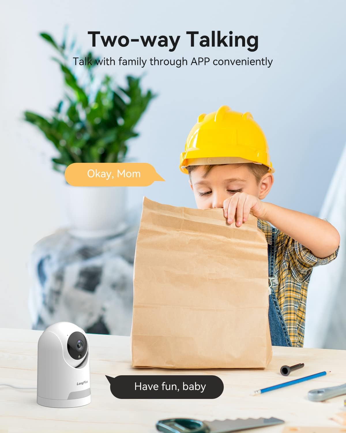 360°View Pan Tilt & Night Vision: Automatically senses and tracks the action in your home in full 360°. LongPlus home security camera Cover every angle with 355° horizontally and 270° vertically. Night Vision is up to 30ft and can be seen clearly in darkness. Just need one indoor Baby Pet Monitor Camera with APP, you can create a panorama and rotate the camera to view every corner of your home.