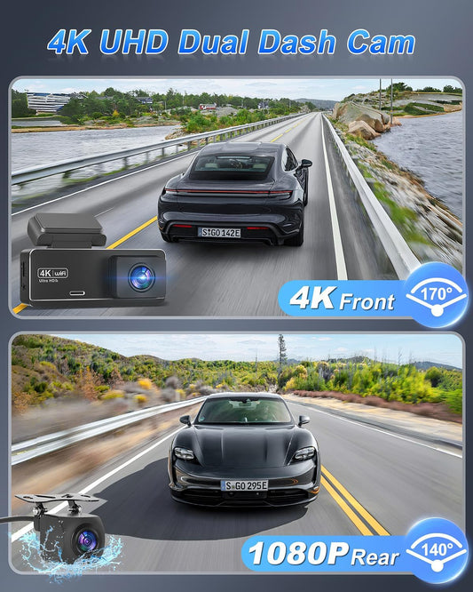 4K Dual Dash Cam Front and Rear with 1.47" Display, Wi-Fi Car Camera with 64GB Card, G-Sensor, App Control, and 24H Parking Monitor